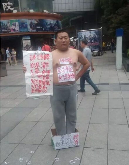 昨天,一男子半裸站在重庆街头,自称是清华大学博士,由于家庭困难,无法实现留学梦,就在街头卖身。 “少一元钱都不卖,因为我值500万”。男子说,“如果哪位富婆出钱,就可以实现梦想了,出国深造,几年后海归回国,一定报效祖国!”
