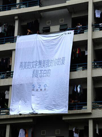 “再美的文字赞美我的对你的爱都是苍白的,520民政局见”,广州大学城大三男生小华称“苍白体”是内心真实写照,收到广告后,师姐下楼见到小华,表示非常感动,但是师姐告诉小华自己打算考研,恋爱的事情以后再说,并劝小华好好读书。