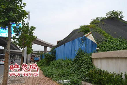 航海路西三环东北角,有一高约5米的垃圾土堆,南侧用施工挡板遮挡,顶部被绿藤覆盖,远看像一座假山。一刮风导致附近小区尘土飞扬、蚊蝇乱飞,环境恶劣。据悉,该土堆两年无人清理,居民认为影响郑州形象。