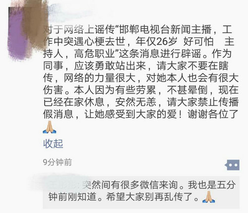 微博上晕倒的女主播为《邯郸新闻》主播,在主持当地一项发布活动时因劳累而晕倒在地,并被网友拍了视频发在网上,称其猝死。为此,彤彤特意发了一条朋友圈来辟谣,提醒大家不要传谣以免给本人造成伤害。