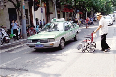 老人推轮椅过马路,一出租车打方向避开