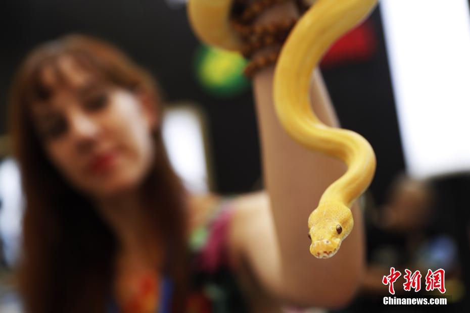 8月24日,蜥蜴、蛇、蜘蛛、土拨鼠等新派爬宠齐聚上海宠物展,吸引时尚男女前来观赏。据了解,爬虫类近年正逐渐取代传统意义上的宠物,成为年轻人彰显个性的新宠。图为一美女训蛇师展示盘在手臂上的黄金蟒蛇。 中新社记者 张亨伟 摄