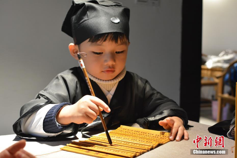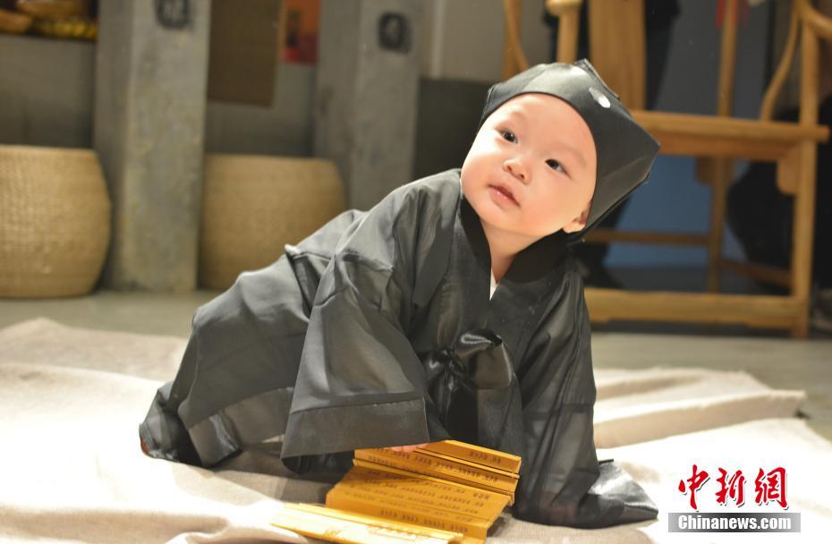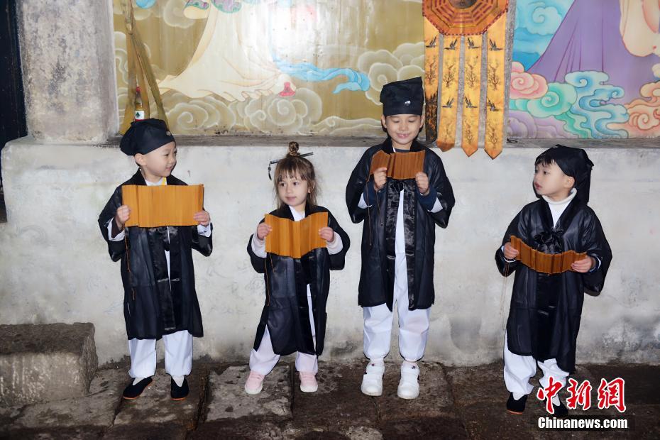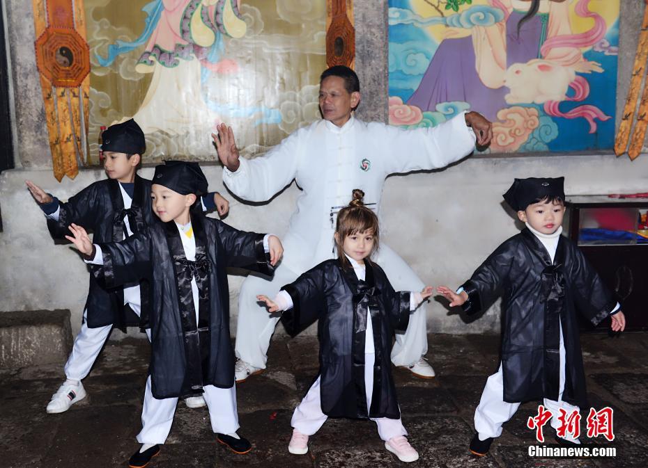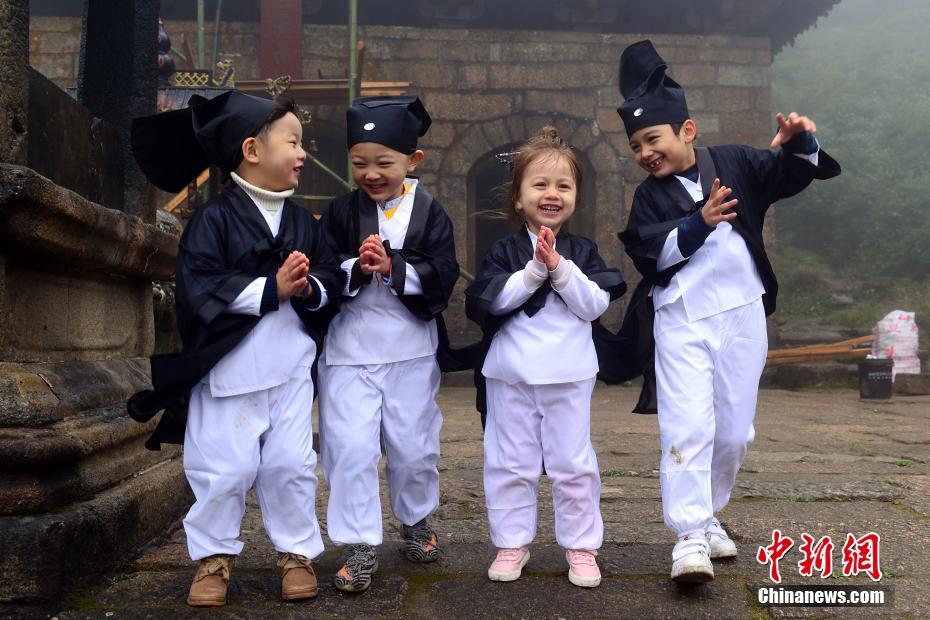 10月16日,在“道教名山”、世界自然遗产地江西上饶三清山,5名来自中外的萌娃身穿统一道服,手持竹简,在三清宫跟着道教师傅朗读《道德经》、《弟子规》,学习太极拳、书法、古筝等中国传统文化。这群萌娃中年龄最小的仅11个月,年龄最大也只有6岁。 程希雪 摄