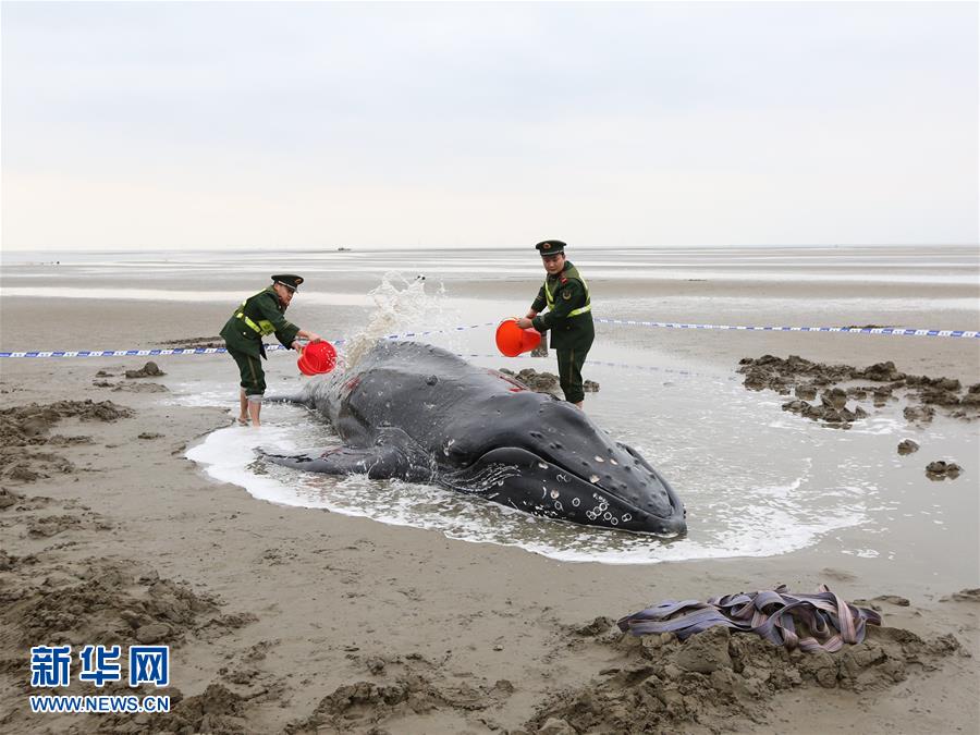 当日中午,江苏省启东市连兴港渔民在海滩上发现一头搁浅的座头鲸,接到报警的连兴港边防派出所迅速联系渔业部门,并组织警力展开救援。在多方共同努力下,这头座头鲸在下午海水涨潮后重返大海。