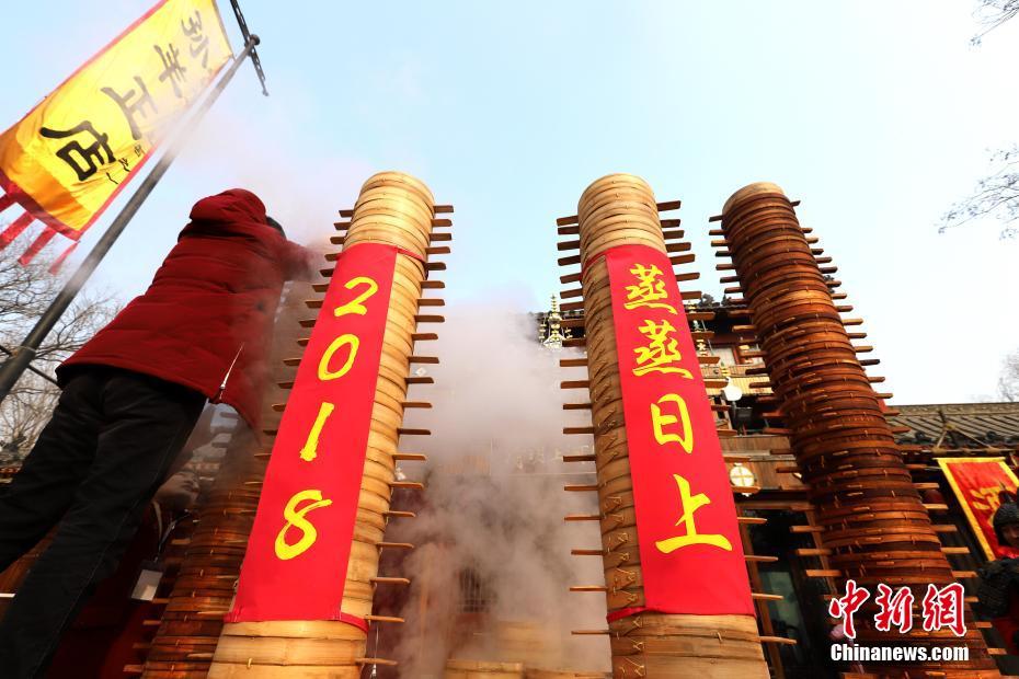 2018年1月1日,河南开封清明上河园孙羊正店门前,现场高高叠起的小笼包热气腾腾,小笼包上喜庆的红字写着“2018”“蒸蒸日上”。“宋徽宗”带领“后宫佳丽”为游客免费发放刚刚蒸好的小笼包,寓意新的一年“蒸蒸日上”,吸引数千名游客争相品尝求好运。据清明上河园市场部石经理介绍,为了给游客送上这份新年祝福,清明上河园启用了多个地方一起蒸小笼包,当天共准备了2018笼开封名吃“灌汤包”,在多个发放点陆续为民众送上新年的“免费午餐”,祝愿大家都能够在新的一年里“蒸蒸日上”。中新社记者 王中举 摄