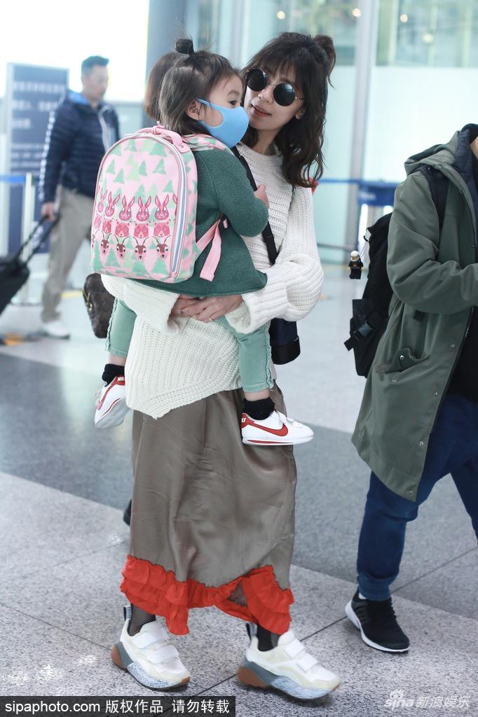 2018年3月20日,北京,贾静雯抱女儿咘咘现身北京机场。