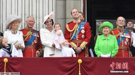 当地时间2016年6月11日,英国伦敦,英国女王伊丽莎白二世的90岁官方生日庆典举行,英国王室成员登上白金汉宫阳台观看皇家军队阅兵仪式。英国女王伊丽莎白、菲利普亲王、查尔斯王子、卡米拉、威廉王子夫妇、乔治小王子和夏洛特小公主、以及哈里王子等皇室成员出席。