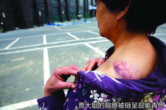 20:50许,一些挨砸的舞友与小区物业发生争执,方女士报警,民警赶来平息纠纷时,贾女士左肩被砸出巴掌大小的紫色清淤血块,被送往医院诊治。