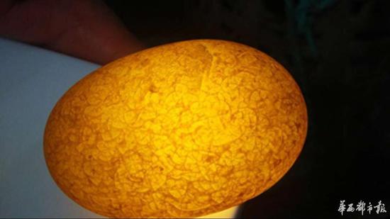 那么村民挖出来的宝石是什么样子,杨先生拿出一块比鸡蛋小的石头,用手电筒光线照,里面五光十色,很漂亮。