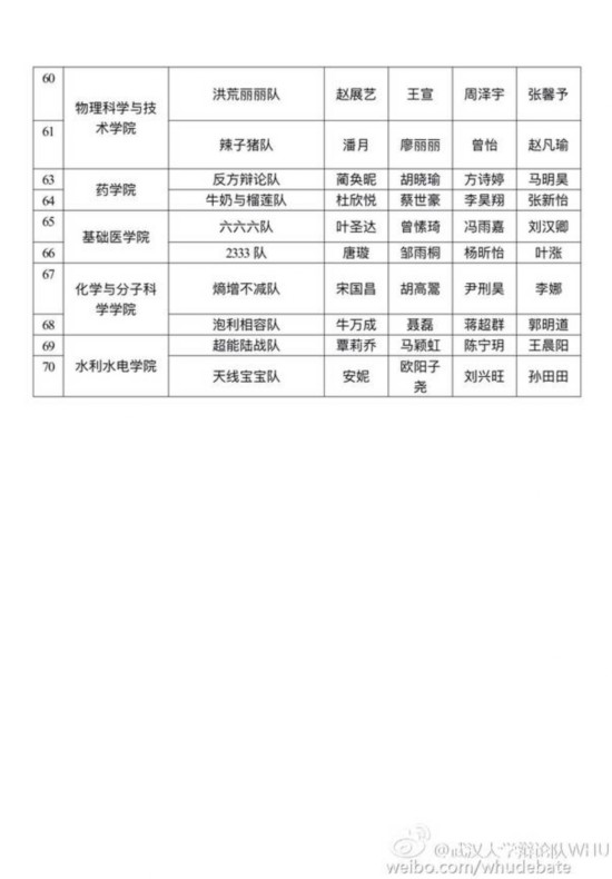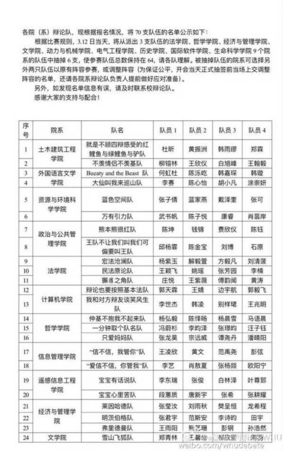 今日(3月12日),武汉大学辩论队官方微博“武汉大学辩论队WHU”上传了一张武汉大学辩论队名单公示图,各路奇葩的队名让一众网友笑喷。