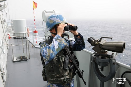 3月21日,海军第十一护航编队首次独立执行护航任务。“青岛”舰警戒哨正在观察海面情况。米晋国摄影