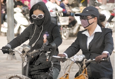 昨日上午,省会刮起大风,气温骤降。桐柏路上,两位骑车的女士为了防风,严加保护。 记者 张翼飞 图