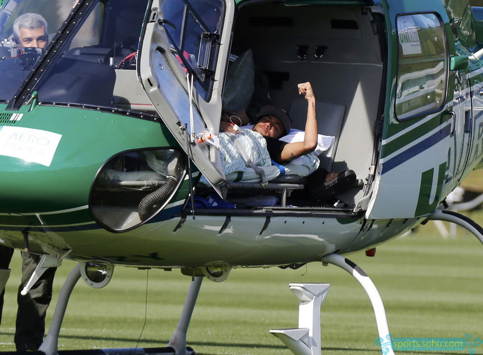 在巴西2-1击败哥伦比亚的1/4决赛第88分钟,巴萨前锋被踢伤,并直接被担架抬出场外。随后的检查显示,他的第三节椎骨骨裂。