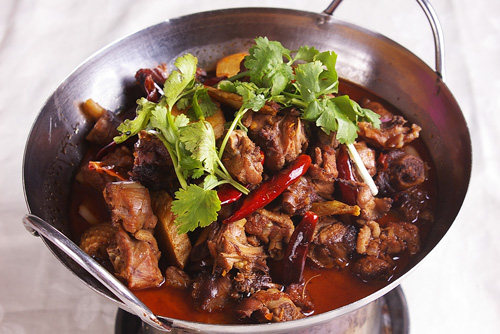2、姜、蒜、红辣椒切丝切快,放入和鸭子同炒;