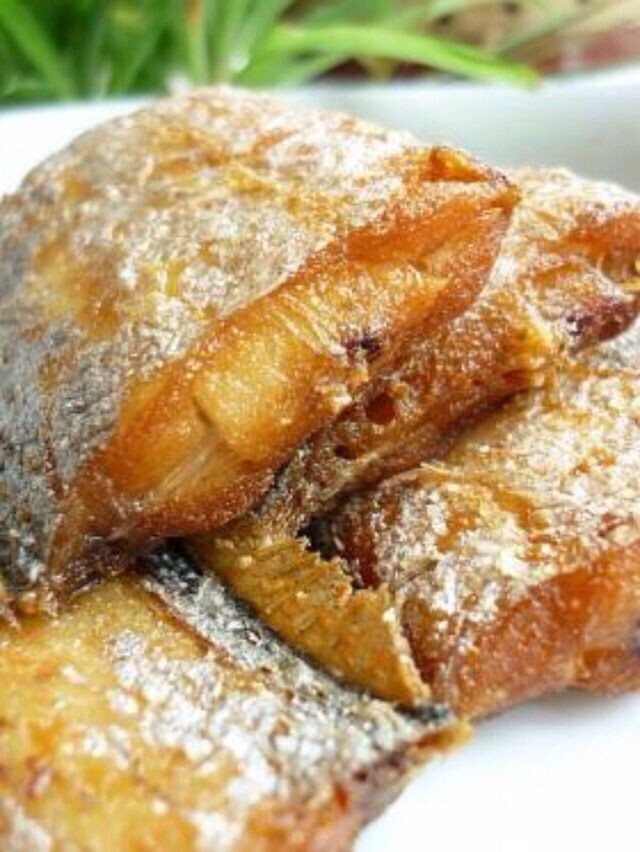 4).平底锅中加入少许的油,烧热到5成热,用厨房纸巾擦干带鱼身上的水份,裹上一层干淀粉,再将多余的淀粉抖掉,放入油锅中;