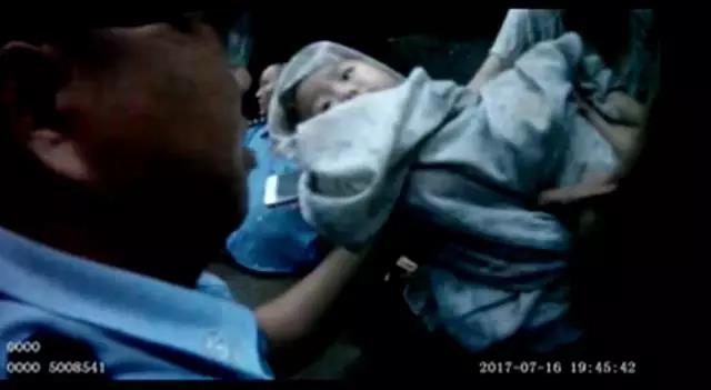 由于积水太深,为了不让孩子受到伤害,辅警张婧先把最小的婴儿接过来,高高举起,缓缓走到岸上。