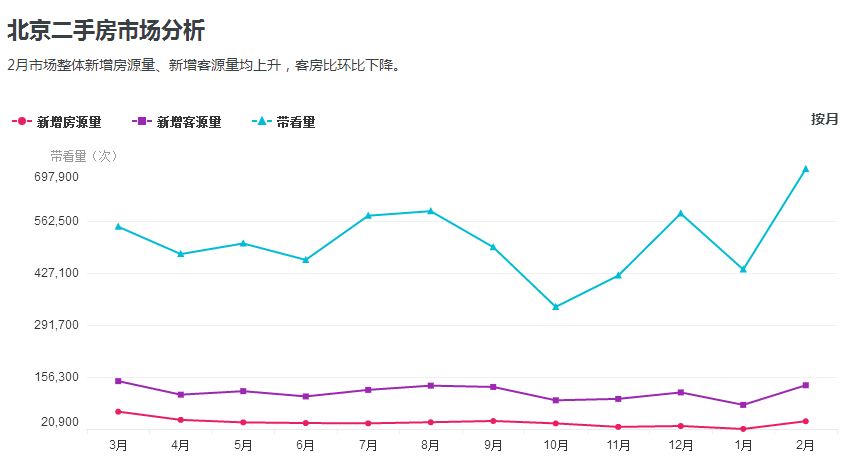 链家最新数据显示,北京二手房市场方面,2月新增房源量41181套,环比上月上涨96.67%。2月新增客源量134717人,环比上月上涨60.88%。2月带看量697875人,环比上月上涨60%。新增客房比达到3.3,这意味着市场上每增加1套房子的同时,会有3.3位新买房客户出现。